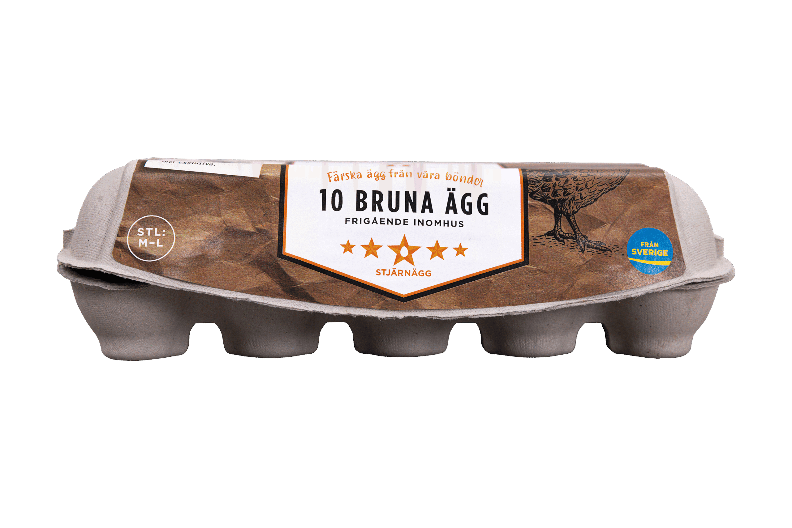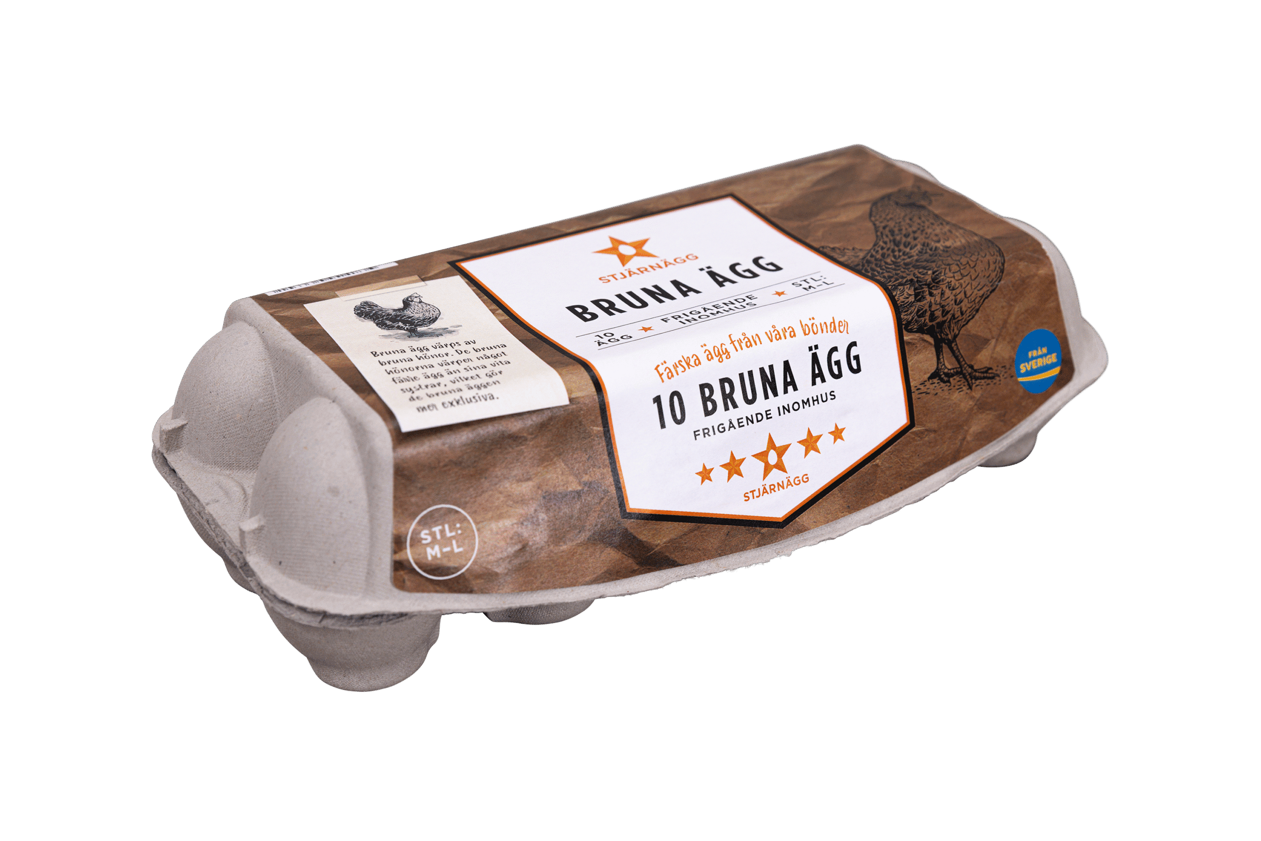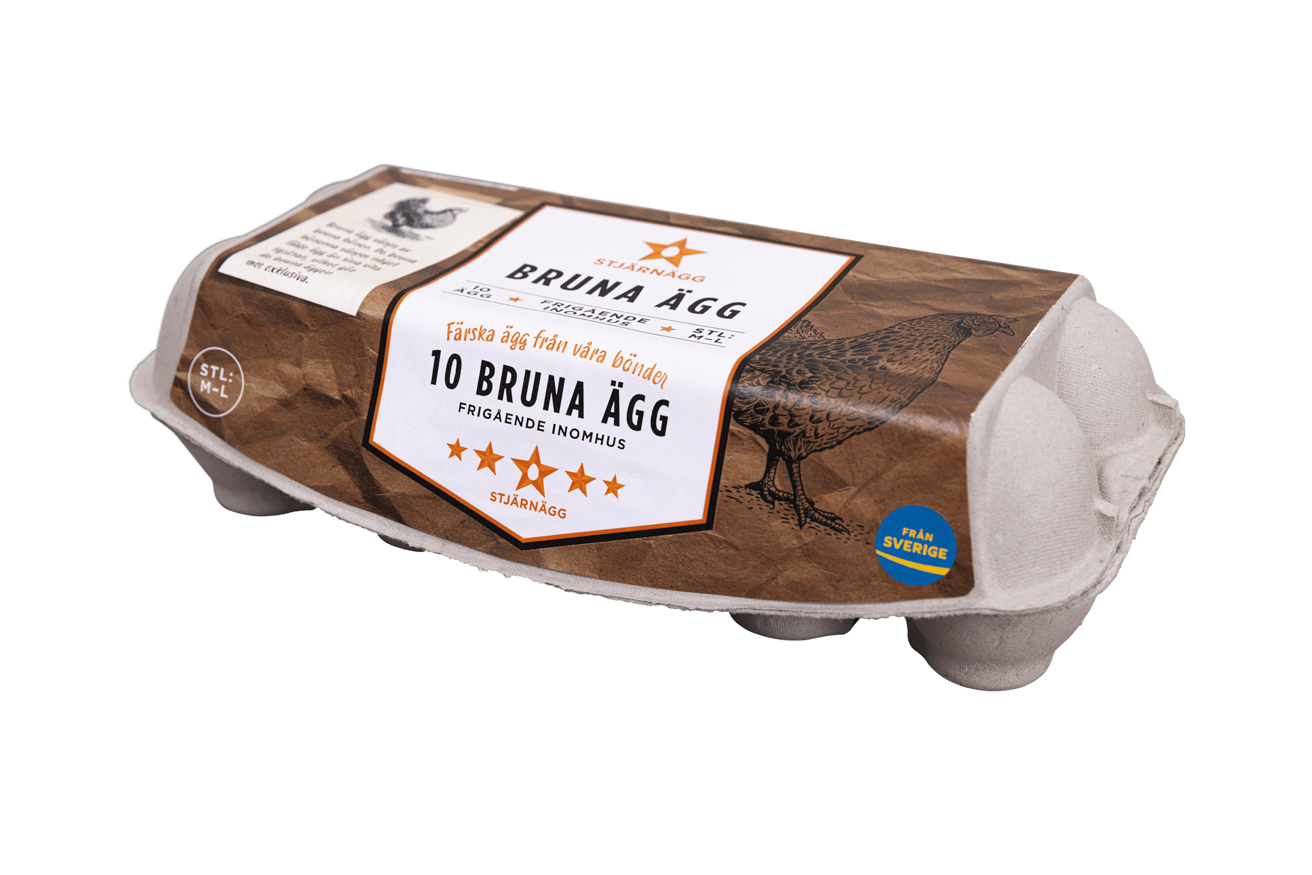 En kartong med 10 bruna ägg märkta Bruna Ägg med bilder av en kyckling och skandinavisk text på en brunvit förpackning.