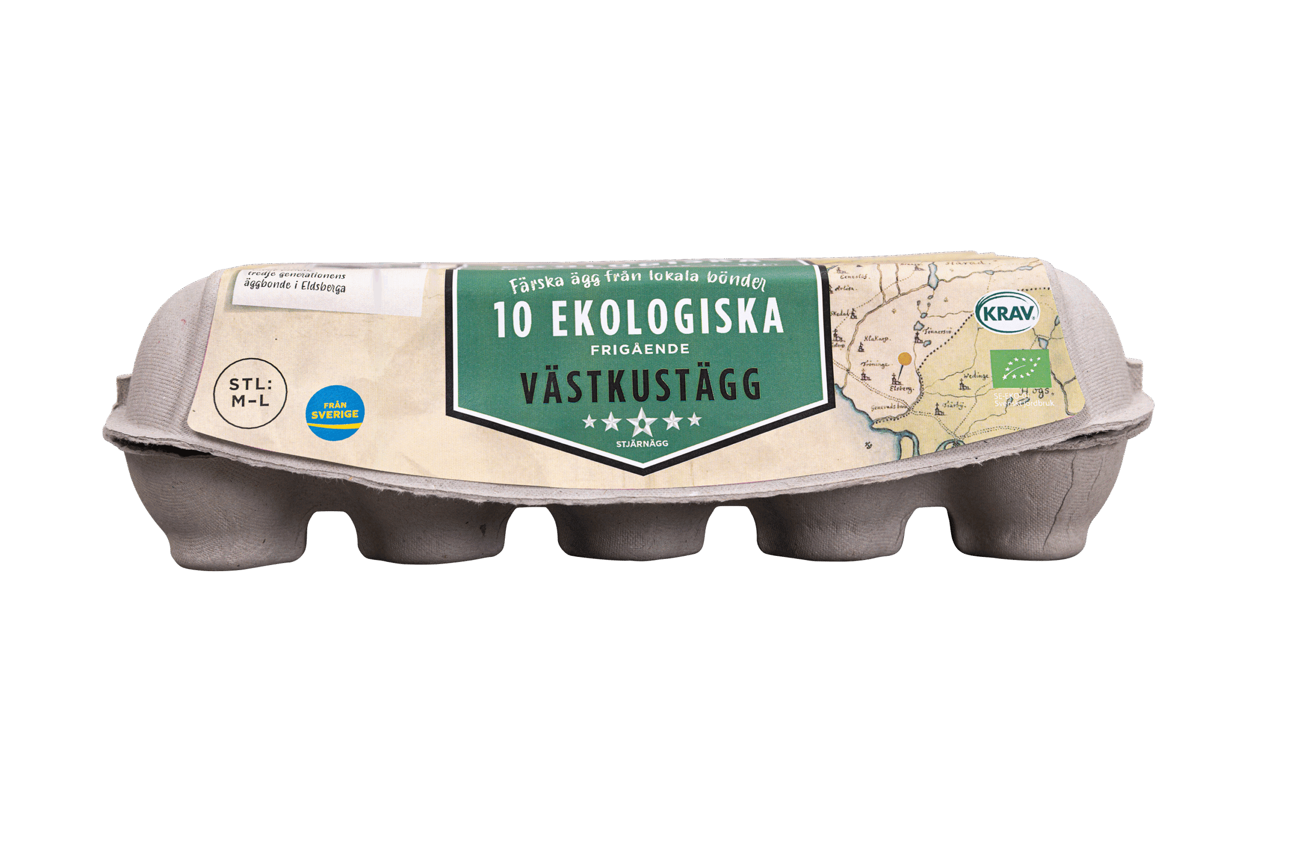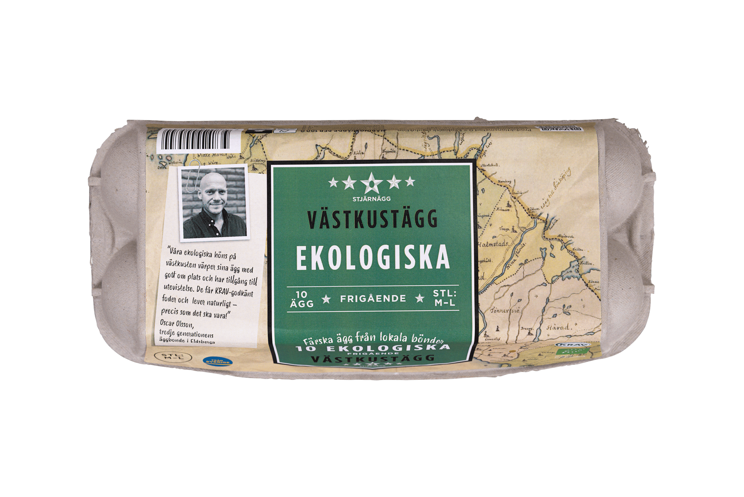 En kartong med ekologiska ägg från Västkustägg med svensk text på etiketten som anger 10 miljövänliga ägg. På förpackningen finns en karta, en gårdsbild och logotyper för ekocertifiering.